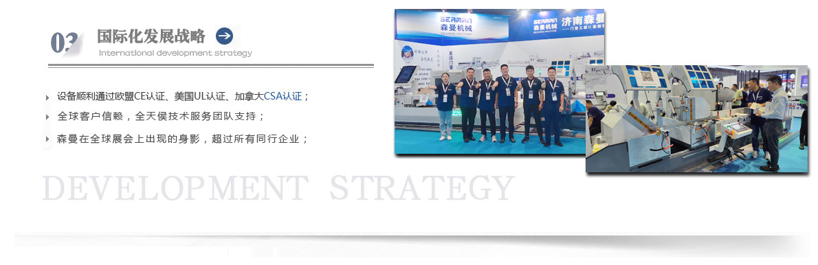 “森曼機械”作為全球門窗設(shè)備供應(yīng)商,本著"seaman"精神,勇立潮頭,拼搏創(chuàng)新,以爭做行業(yè)為目標,在行業(yè)前輩發(fā)展的基礎(chǔ)上,努力學習,積極進取。目前公司產(chǎn)品涵蓋塑料門窗設(shè)備、鋁合金門窗設(shè)備、鋁幕墻設(shè)備、鋁木復合門窗設(shè)備及中空玻璃設(shè)備五大種類,近百個品種。公司產(chǎn)品銷售至全國各地及東南亞、非洲、東歐、北美等幾十個國家和地區(qū)。在這個競爭激烈的年代,我們正努力使我們的產(chǎn)品!